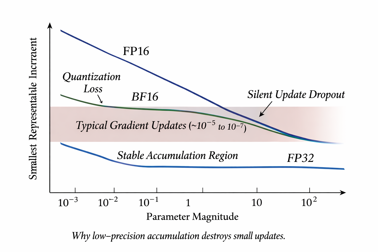 Implication for updates. If and the update , FP16 may not represent when added to — the result rounds back to . Thus, performing repeated incremental updates in low precision leads to loss of meaningful progress.