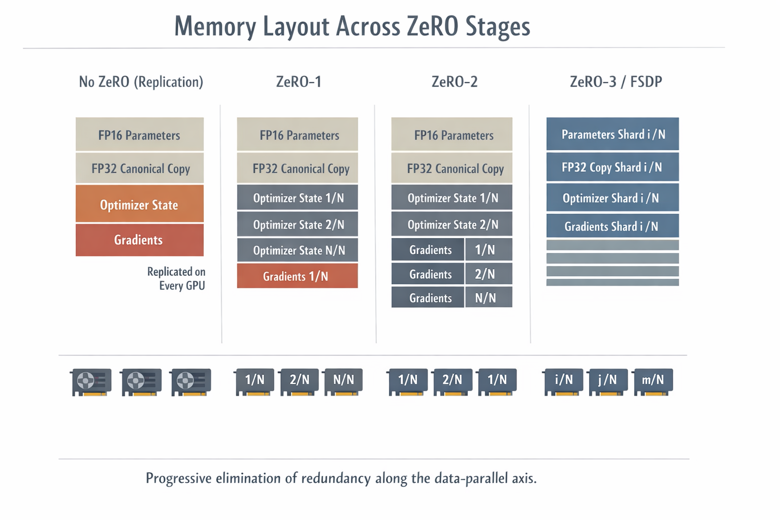 - Introduce ZeRO: sharding optimizer state (ZeRO-1), gradients (ZeRO-2), and parameters (ZeRO-3).