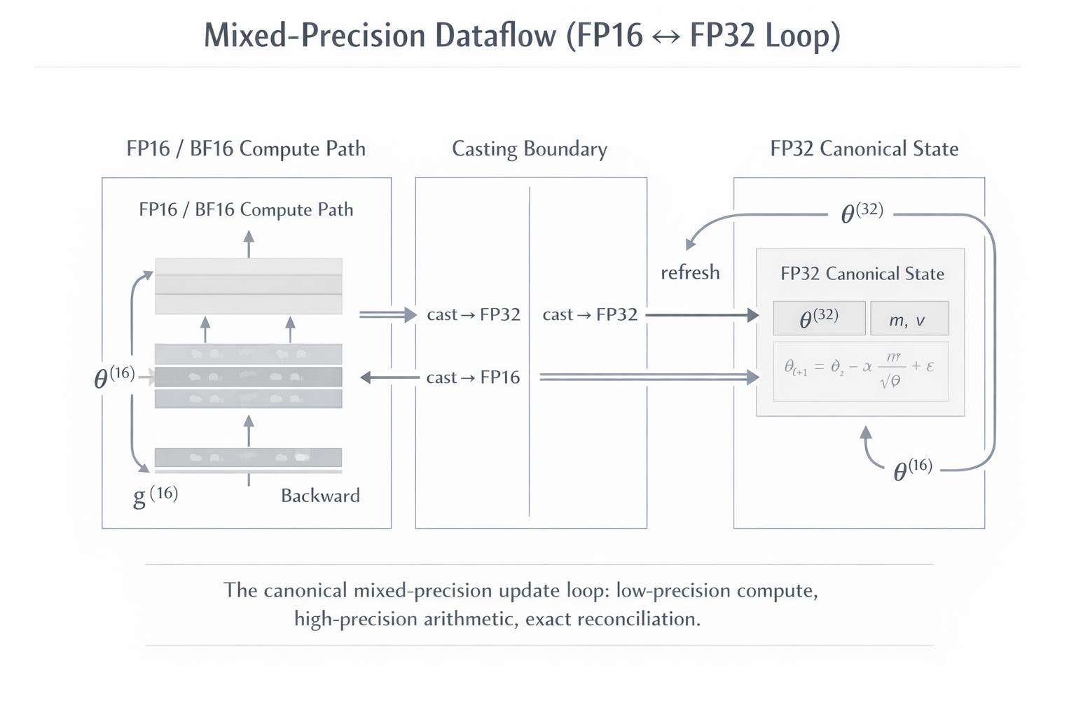 - FP16 compute copy = the working checkbook. You do the arithmetic quickly here and then reconcile with the ledger.